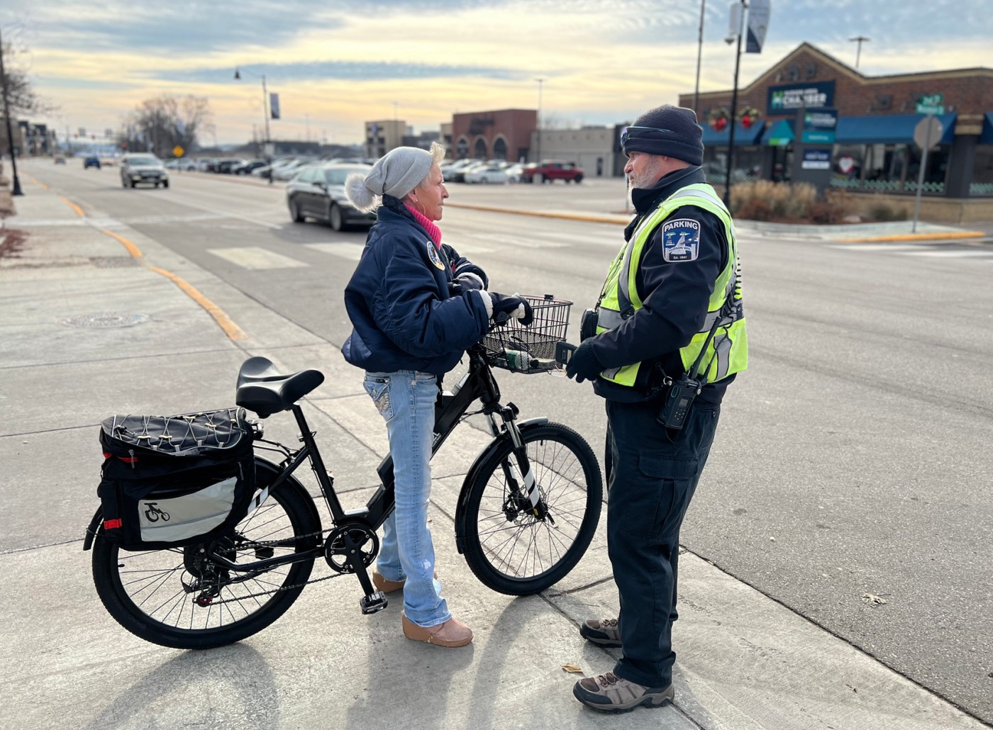 Officials from the Hudson Police Department, Hudson Fire Department, Lakeview Emergency Medical Services, Excel Power Bikes, and Big Guys BBQ Roadhouse presented Barbara Espy with a new electric bike on Dec. 1, 2023. The donation came about when Officer James Wildman (ninth from left, wearing a blue vest) and Hudson police officers reached out to Excel Power Bikes about a possible replacement bike, and the company came forward with a donation, Sam Westby of Excel Power Bikes, left, said. “This made me whole again,” Espy said. “This, for me, is everything.” (Jon Muller / Lakeview Emergency Medical Services)