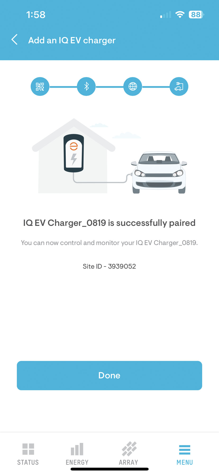 The paying-for-itself scenario covers the $835 price of the unit I have, which is the Enphase IQ 50 EV Charger in the 40-Amp Model with the NEMA 14-50 plug option.