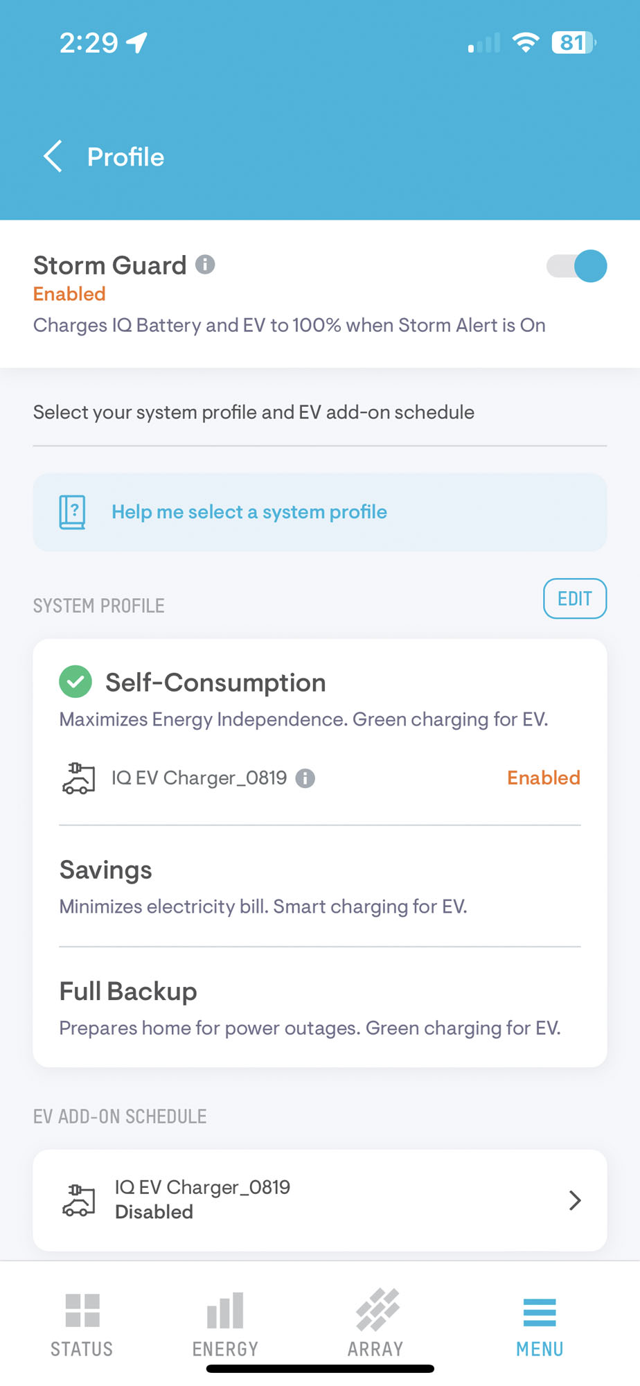 The Enphase software, just like when using it for your home solar system, is intelligent in that it has a Storm Guard system that automatically enables upon the detection of severe weather headed to your location. The Storm Guard also applies to your EV charging automatically with the IQ EV Charging unit. If your EV is connected to the charger and a storm is headed your way, the Storm Guard will automatically charge up your EV before the storm hits to provide you with a charge ahead of a looming power outage at your house.