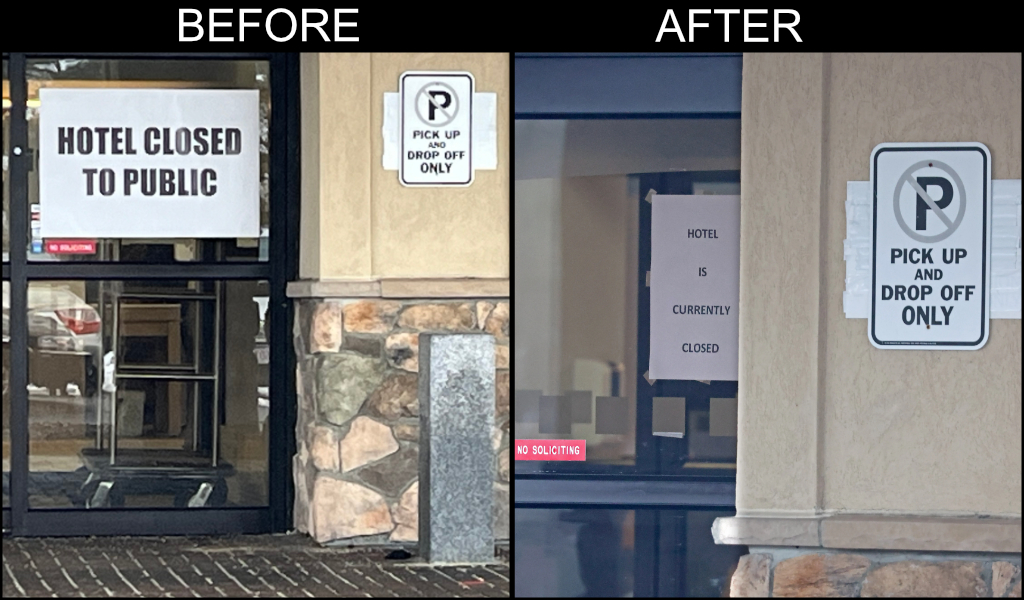 The next day, the “hotel” removed the sign and replaced it with something smaller and slightly less obvious.