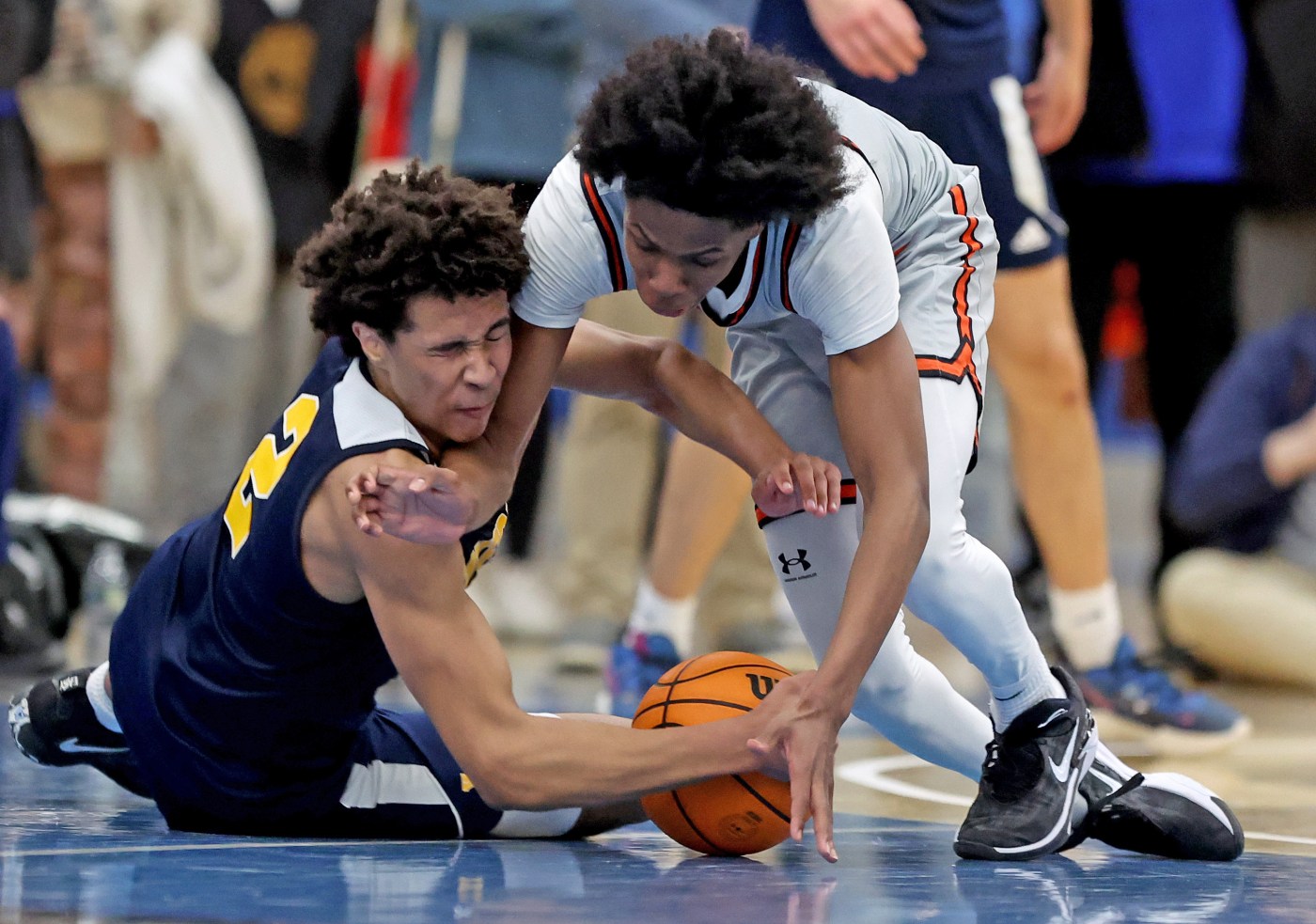 North High’s Teshuan Steele, center, gets tangled up with Xaverian’s Lorenzo Carrara, left, and Roman Perdoni at UMass Boston on Wednesday. (Matt Stone/Boston Herald)
