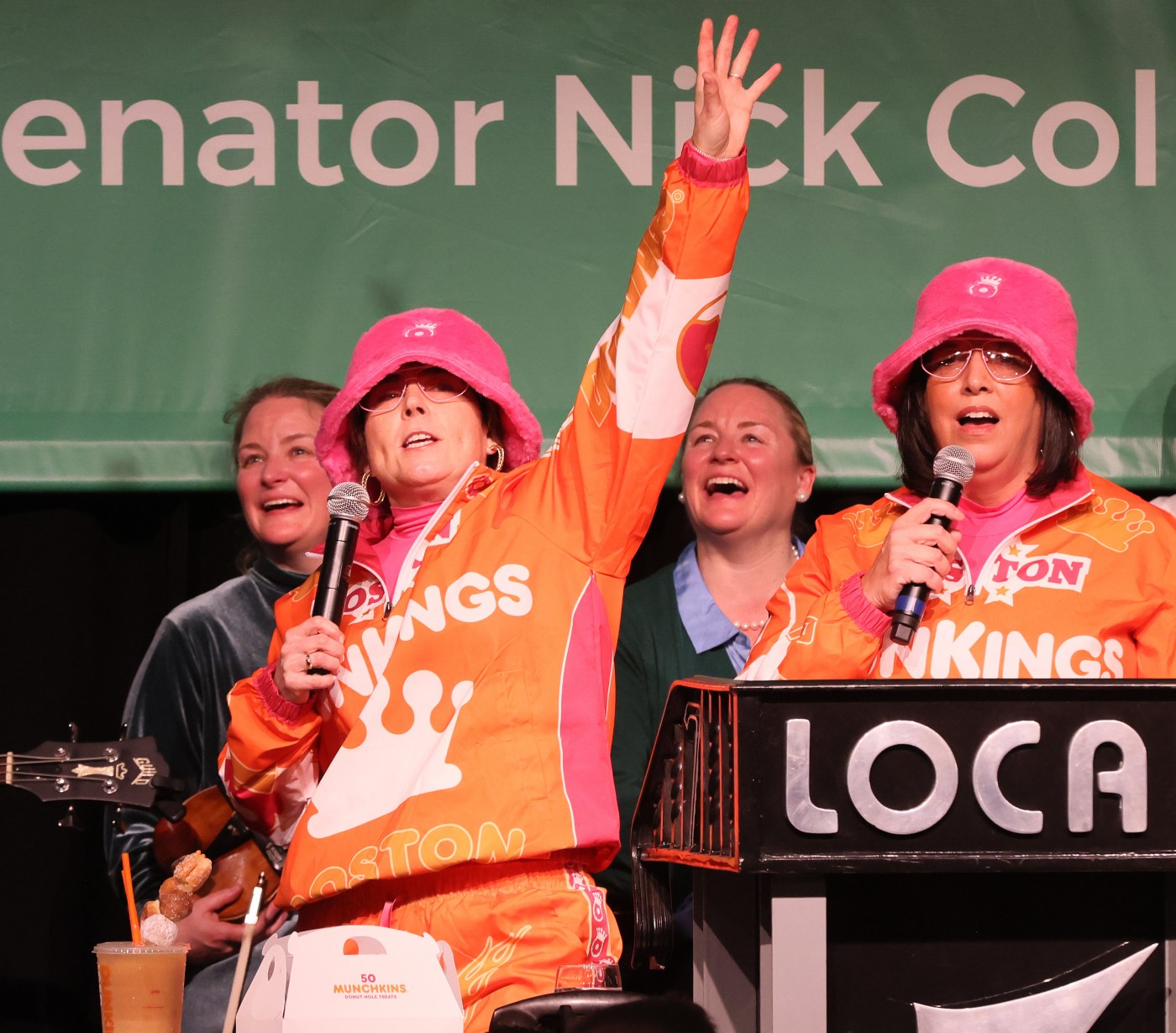 Oh, wait a minute there she is, prancing around in a bright orange Dunkin’ suit on TV on St. Patrick’s Day. She’s not hiding. Kind of hard to miss a bright orange Dunkin jumpsuit. I guess we’re okay now.