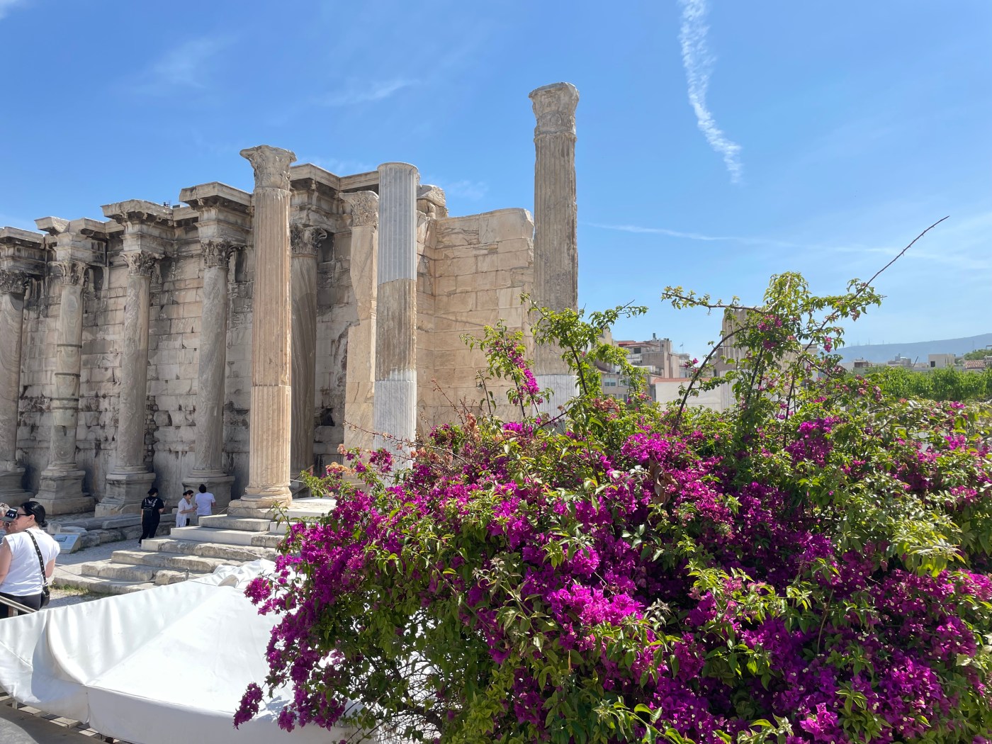 My husband, an archaeologist, and my 18-year-old son, who is his dad’s biggest fan, joined me on the trip, and those first few hours were special for all of us. Not only could we peep Athens’ most famous structure, the Parthenon, from where we were, but we also stumbled upon Hadrian’s Library, created by the Roman emperor in 132 A.D. Gorgeous pillars reach toward the sky on the middle-of-the-city site, which was surrounded by beautiful flowering bushes, making a picture-perfect scene.