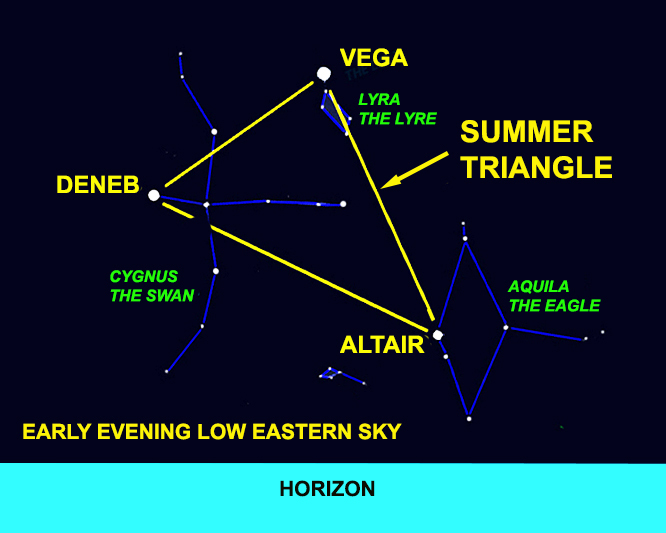 The official first day of summer isn’t until June 20, but already, there’s a sure stellar sign of summer on the rise. When the night sky finally darkens around 10:30, the “Summer Triangle” emerges in the eastern sky. Unlike the 65 to 70 official constellations we can see around here, the Summer Triangle is an “asterism,” a distinct pattern or picture in the stars that isn’t an official constellation. Most asterisms are composed of bright stars from various constellations, and the Summer Triangle is no exception. It’s a sight that can be enjoyed even from a brightly lit urban area, making it accessible to all. Simply look for the three brightest stars in the low to mid-eastern sky, and you’ve found it. Each of these stars is the brightest in their respective constellations and has unique characteristics.