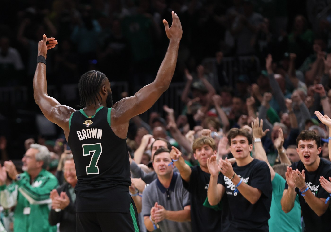 Boston, MA – Boston Celtics’ Jaylen Brown celebrates at the end of Game 2 of the NBA Finals at the TD Garden . (Nancy Lane/Boston Herald)
