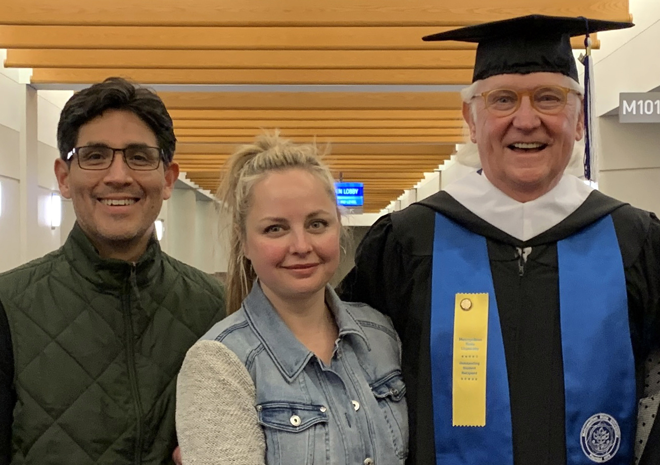 Ashley Shelby, center, with her husband, Emmanuel Benites, right, and her father, Don Shelby, at Don’s commencement ceremony at Metropolitan State University. (Courtesy of Ashley Shelby)
