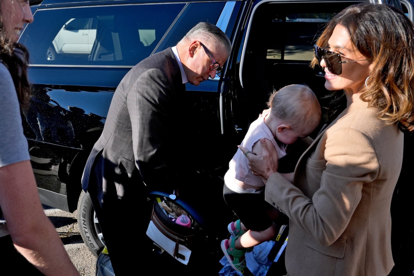 On Tuesday, the Baldwins and one of their seven children, a toddler, arrived at the New Mexico First Judicial District Court in Santa Fe. Jury selection was scheduled to begin in Baldwin’s trial on charges related to the 2021 shooting death of cinematographer Halyna Hutchins on the set of Baldwin’s Western film “Rust.”