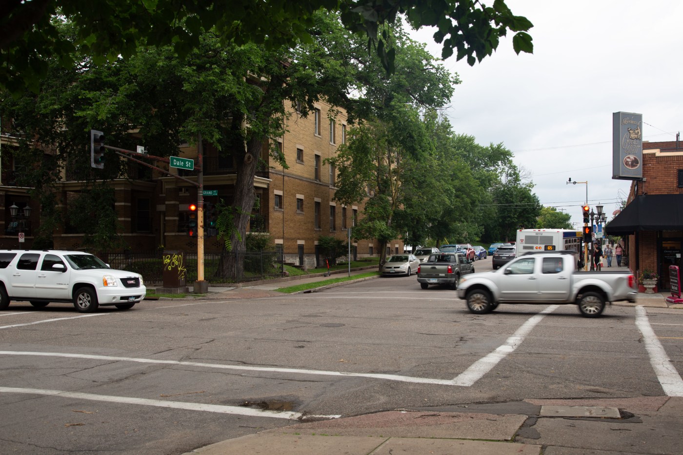 At the corner of Grand Ave and Dale St. in St. Paul, there is a steady flow of cars and pedestrians on Monday, July 15, 2024. (Devanie Andre / Pioneer Press)