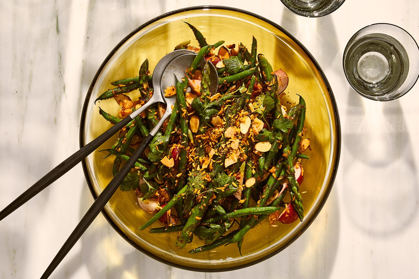 This sweet and salty salad celebrates the best of spring, starting with a base of asparagus and green beans. The crispy coconut almond topping is loosely inspired by serundeng, an Indonesian spiced coconut condiment, which adds texture to the salad. You can grill the beans and asparagus to add a smoky flavor to the dish or swap out the asparagus for runner beans, Broccolini or any spring vegetable. All the individual salad elements can be made in advance, but you’ll want to assemble just before serving for the best results.