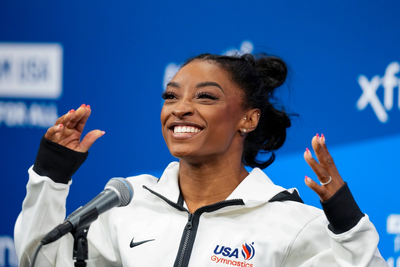 “Nobody’s forcing me to do it,” Biles said. “I wake up every day and choose to grind in the gym and come out here and perform for myself just to remind myself that I can still do it.”