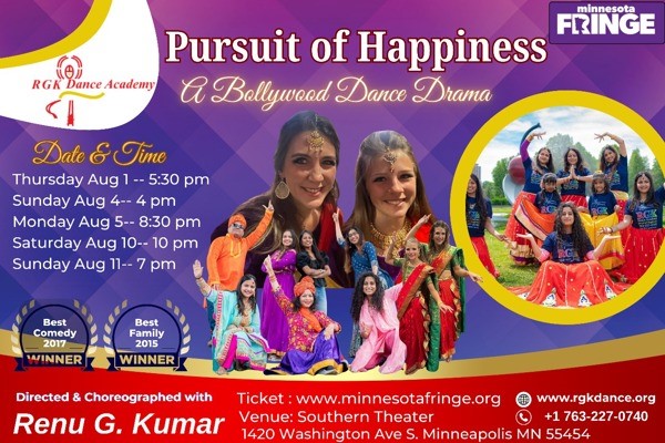 Bringing Bollywood back to the Fringe is a welcome idea, as stage musicals in the style of colorful, high-energy, dance-filled films from India resulted in three of the most popular shows of last decade’s Fringes. The genre requires disciplined dancing, engaging acting and eye-candy costuming, but only the latter is found in this Indian travelogue with minimal story attached, for which the cast of 43 and tech crew all seem woefully under-rehearsed. But kudos to the kids who best execute choreographer Renu G. Kumar’s hybrid of classical Indian dance and hip-hop. “Pursuit of Happiness” will likely grow considerably slicker by Fringe’s end.