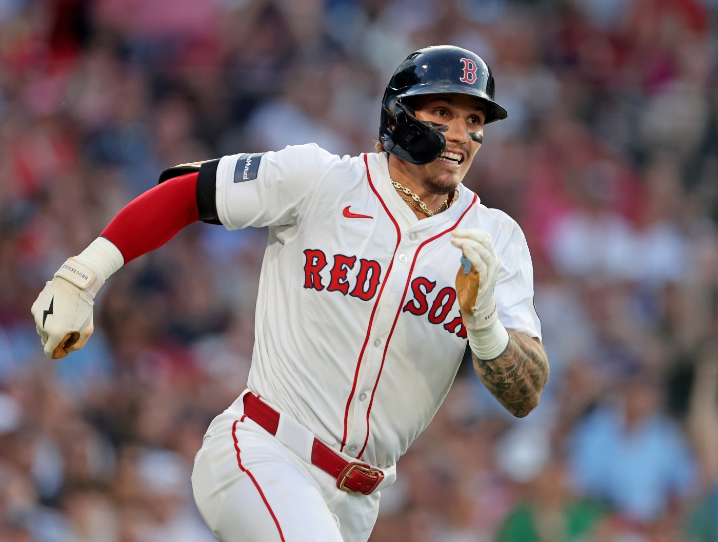 Boston Red Sox outfielder Jarren Duran reacts after hitting a single during the second inning of a July 14 game at Fenway Park. (Nancy Lane/Boston Herald)