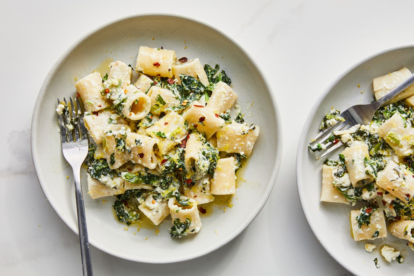 In this speedy, verdant dish, pasta is coated with a tangy feta-yogurt sauce that’s garlicky, creamy and bracing from a dash of red-pepper flakes and some grated lemon zest. Frozen spinach adds just enough in the way of vegetables to make this qualify as a one-pot meal, and it truly needs nothing more to make for a satisfying and very easy dinner.