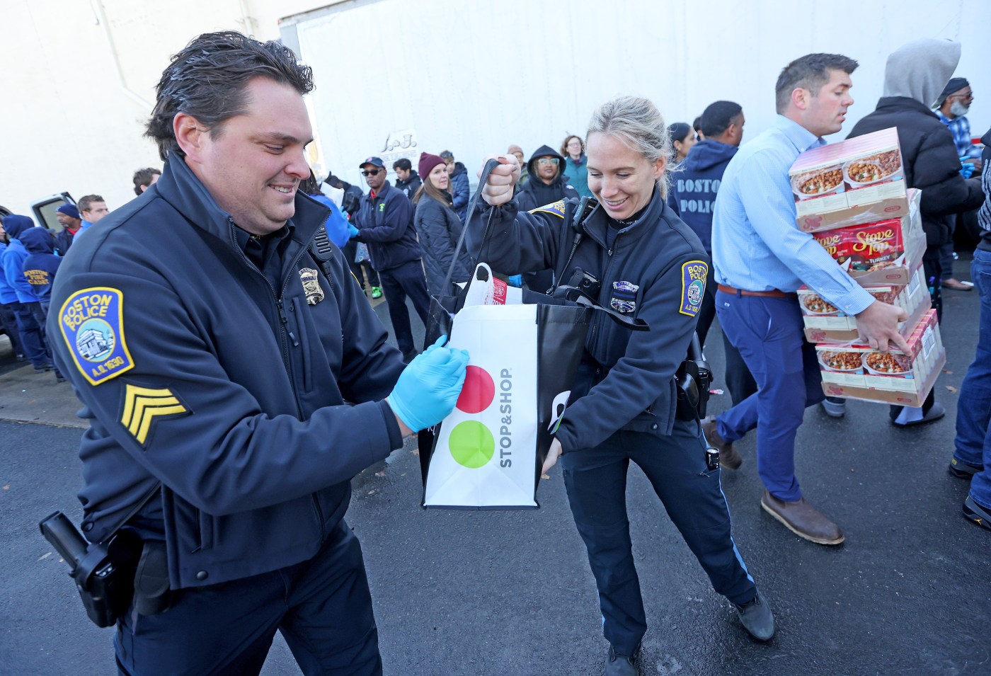 Volunteers from Stop and Shop and the City of Boston, including Boston Fire, EMS and Police help offload 1,500 donated turkeys from Stop and Shop in South Bay as well as stuffing donated from Kraft that went to residents in need. The donation is part of the cities annual Turkey donation drive – organized by the Mayor’s Cabinet of Community engagement.