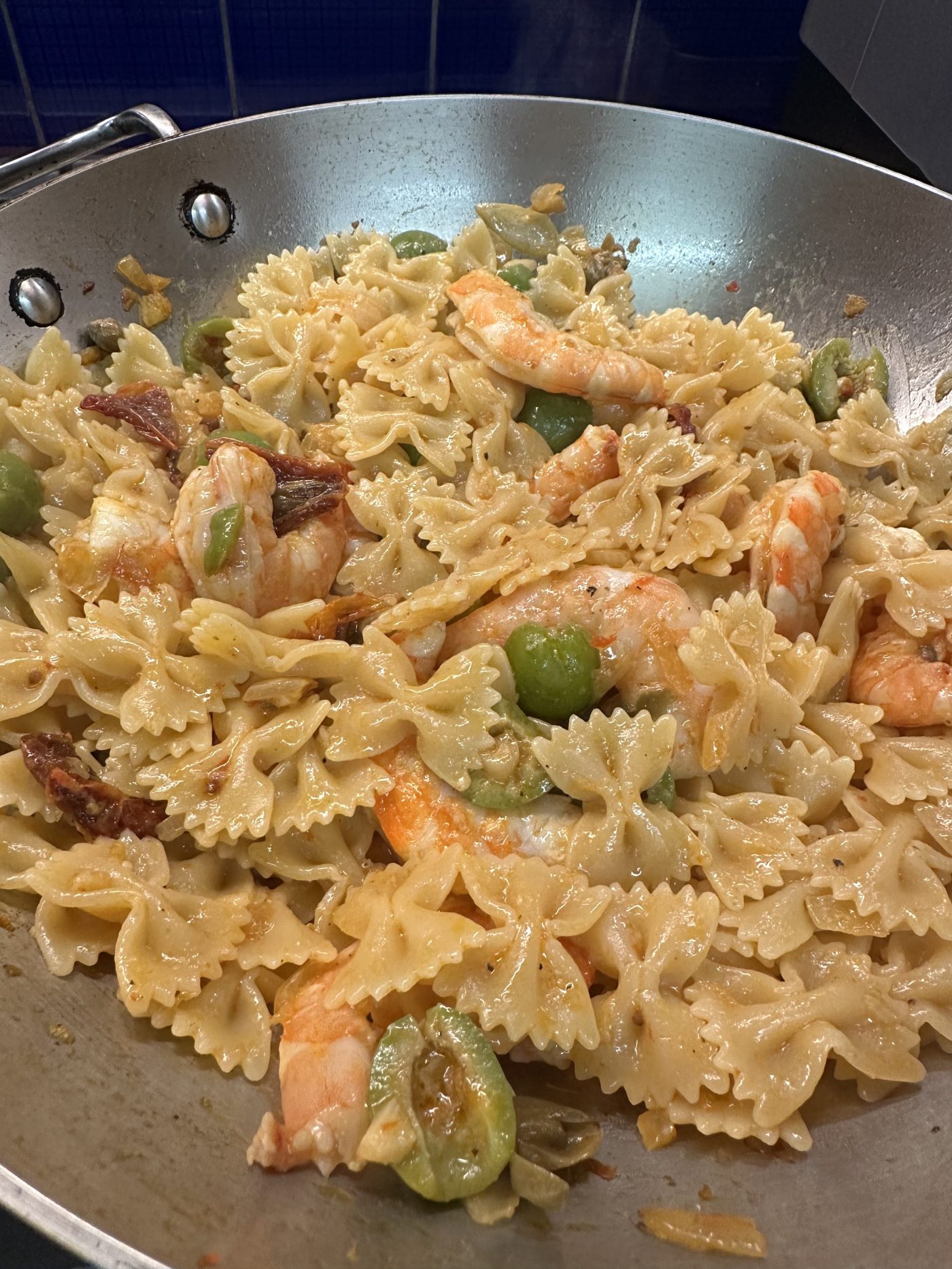 Boil 1/2 pound farfalle (aka bowties) until al dente; scoop 1/2 cup of the cooking water and add to the pan with the shrimp. Stir well; drain the farfalle and add to the the pan with the shrimp mixture. Combine well with the ingredients until everything is hot; season with salt and pepper and serve 4 hungry people.