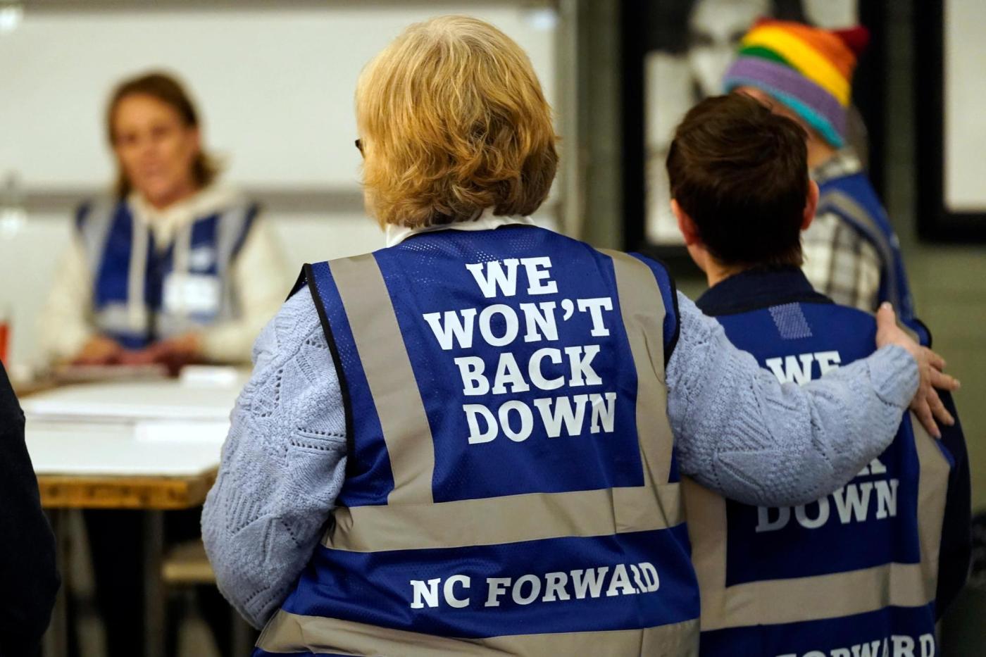 Before their seven-hour bus trip to Washington, Bramble and other members of the Guilford County Women Dems and Friends gathered at a bar in High Point, North Carolina, this week to pass out matching vests and create posters. The group launched a GoFundMe to offset costs and offer bus seats to students.