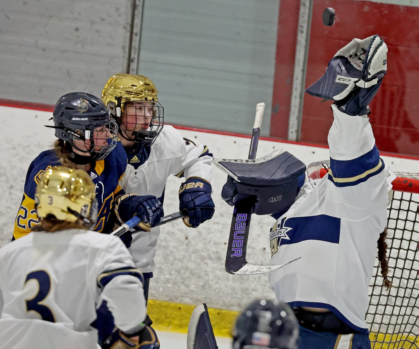 Harper Penna and Darby Rounesville scored, and Bryce Sawyer made 12 saves as Sandwich/Bourne/Mashpee/Carver (6-6-1) defeated Whitman-Hanson/Silver Lake, 2-0. … Aviva Olitsky and Gina Zollo combined for the shutout in net as Bishop Feehan silenced Brookline, 7-0. … Kelsey MacPherson scored twice, and Emily Coito made 30 saves as Hopkinton/Dover-Sherborn topped Wellesley, 2-1. … Tess Parke potted two goals for Dedham in a 2-1 win over Mansfield/Oliver Ames/Foxboro…. Penny Saich sniped a pair of goals, including a shorthanded tally as Norwell/Scituate/Abington nipped Hanover, 3-2.