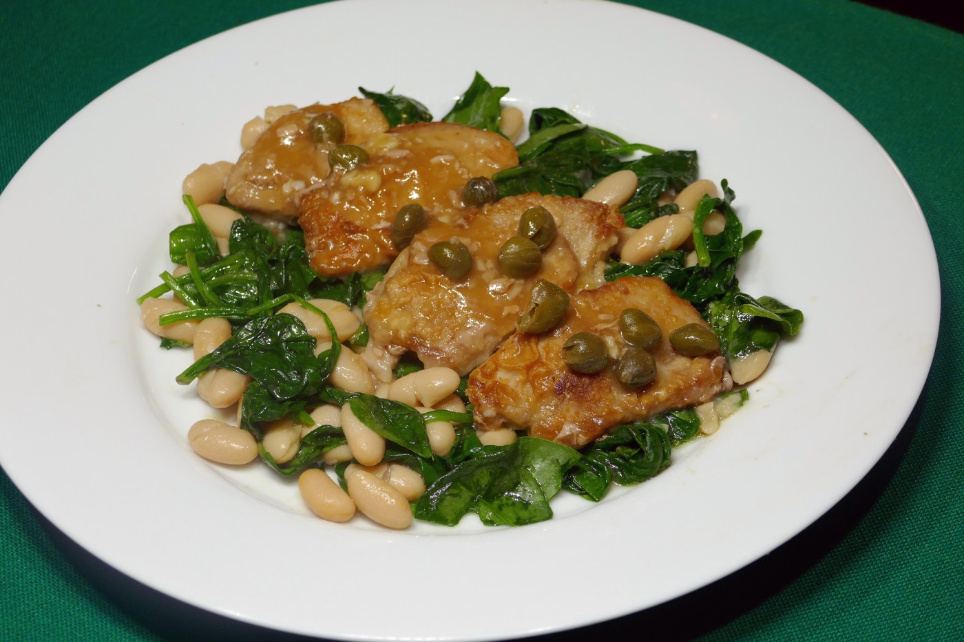 The tangy zest of lemon mingles with the briny notes of the capers. The spinach is combined with cannellini beans that add a creamy texture and lies beneath the pork, soft and velvety, absorbing the savory juices on the plate.