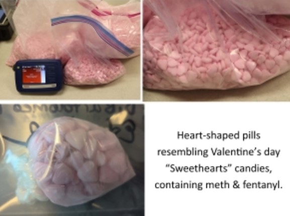“The seizure included nine kilograms (20 pounds) of pink heart shaped fentanyl-laced pills pressed to look like candy,” the U.S. Attorney’s Office said in a statement. “Additional narcotics and five firearms were also seized.