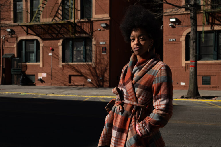 Jasmine Smith, a CityFHEPS voucher participant, in front of her apartment building in the South Bronx. “You just kind of have to take what you can get and you have to feel like a beggar and beggars can’t be choosers,” she said of her housing search.