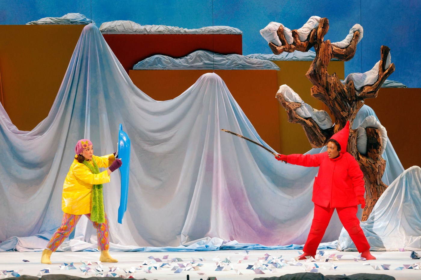 Jessica Jahn’s costume design beautifully captures the iconic red snowsuit worn by Peter. McMillon spends much of the opera in Jahn’s sprightly red costume with its elfish pointy hood, while the other children boast similarly bright and whimsical snow attire.