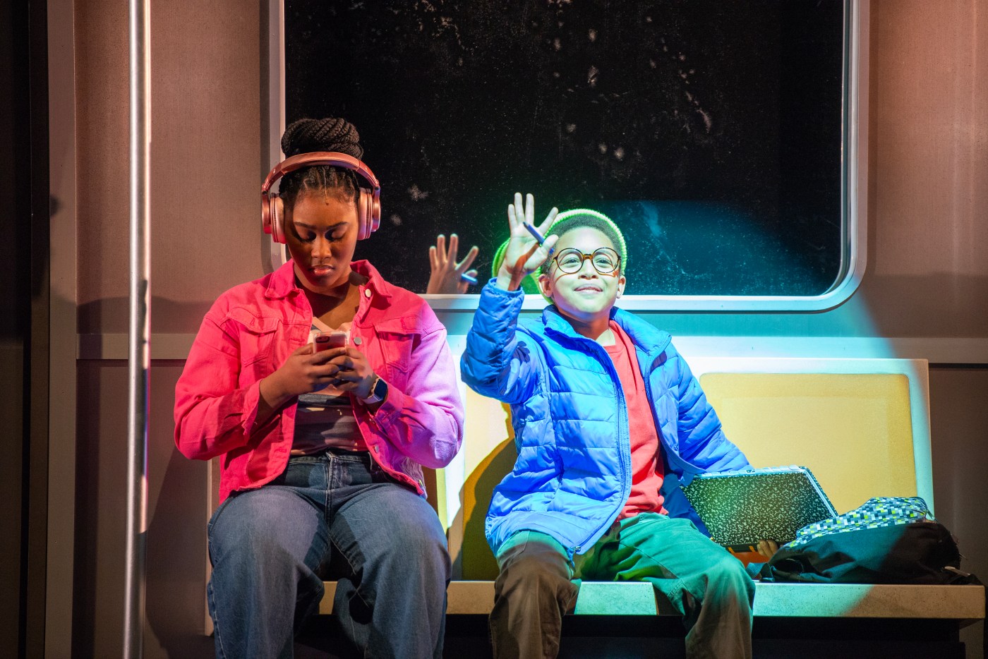 China A. Brickey, from left, Keegan Robinson, Antonisia (Nisi) Collins, Cortlan Gosa, Janely Rodriguez, and John Jamison II in the Children’s Theatre Company’s world-premiere production of “Milo Imagines the World,” a musical adaptation of Matt de la Pena and Christian Robinson’s book about a child who rides the subway and imagines the lives of the other passengers. It runs through March 9, 2025 at the Minneapolis theater. (Glen Stubbe / Children’s Theatre)