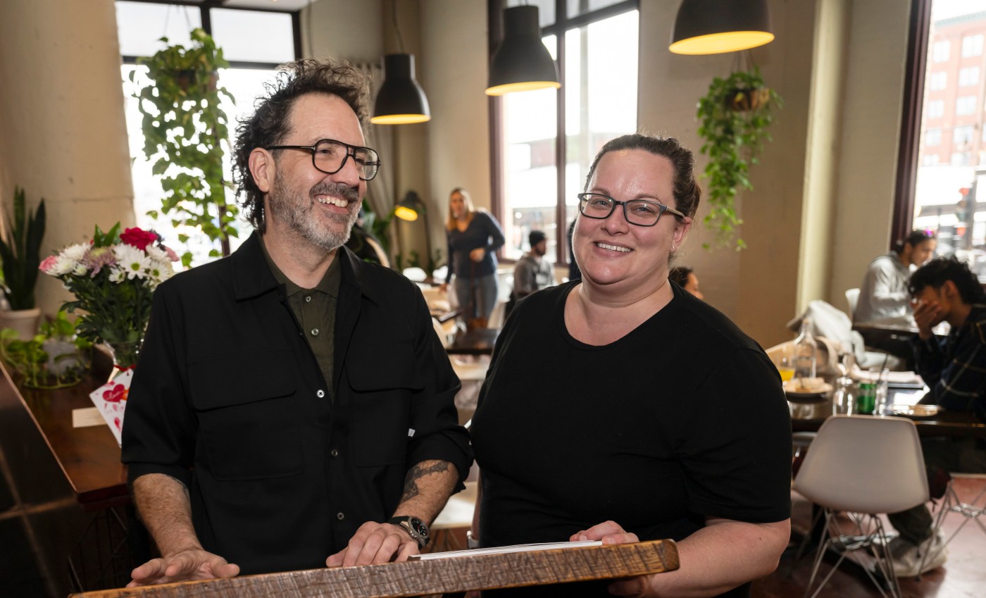Tim Niver, owner of Saint Dinette talks with Amy Daniels at his downtown St. Paul restaurant on Saturday, Feb. 15, 2025. (John Autey / Pioneer Press)