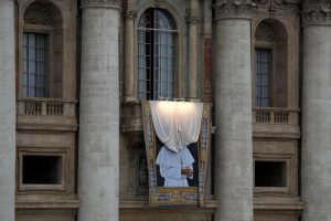 FILE– The tapestries showing late Pope John Paul II, left, and Pope John XXIII hang from the facade of St. Peter’s Basilica as faithful and pilgrims crowd St. Peter’s Square at the Vatican, Friday, April 25, 2014. (AP Photo/Gregorio Borgia)