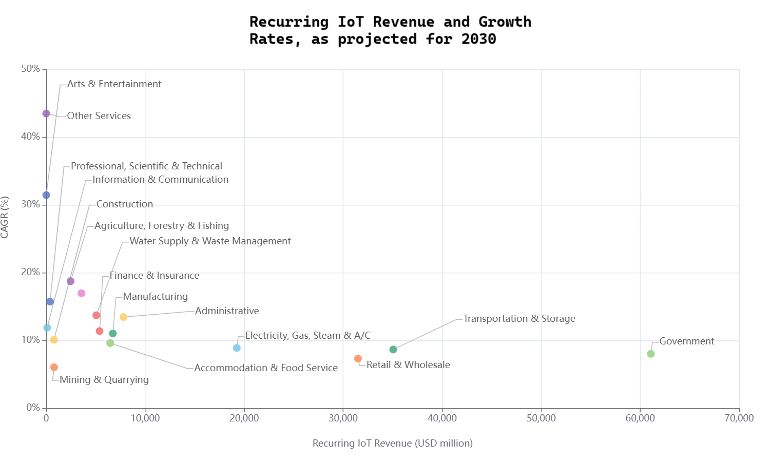 IoT SegmentRecurring Revenue (RR) for 2030 (USD, million)Growth Rate (CAGR, %)Government61082.18.0Transportation & Storage35051.08.6Retail & Wholesale314957.3Electricity, gas, steam & a/c19252.69.2Administrative7808.413.4Finance & Insurance5394.111.4Manufacturing6732.611.0Accommodation & Food Service6463.69.6Water Supply & Waste Management5063.013.7Health & Social Care3559.917.0Agriculture, Forestry & Fishing2461.718.7Construction787.610.1Mining & Quarrying797.86.0Information & Communication93.611.9Professional, Scientific & Technical387.015.7Arts & Entertainment7.631.4