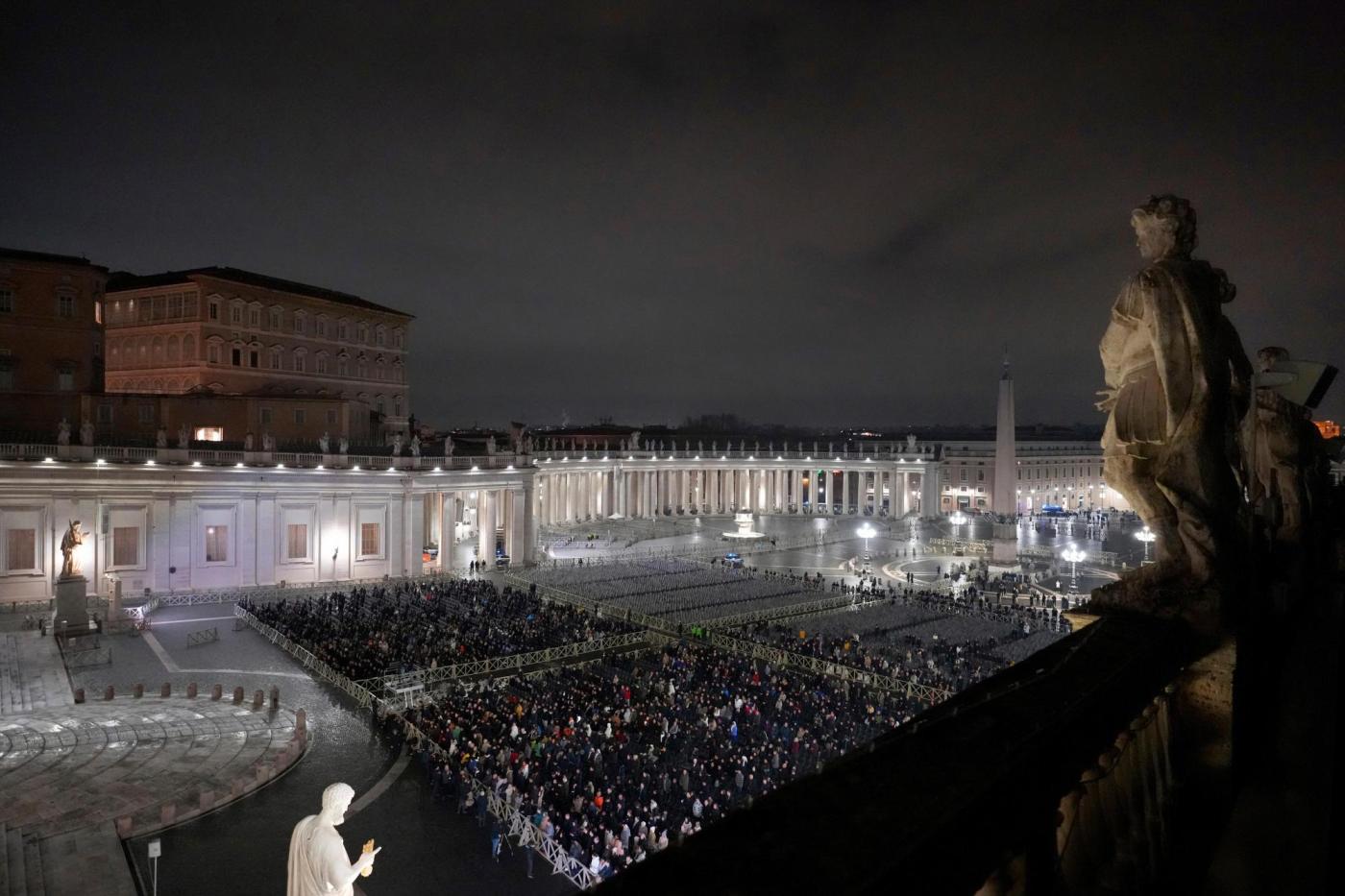 After night fell, thousands of faithful gathered in a rain-soaked St. Peter’s Square for the first of a nightly ritual recitation of the Rosary. The prayer evoked the 2005 vigils when St. John Paul II was dying in the Apostolic Palace, but many of those on hand said they were praying for Francis’ recovery.