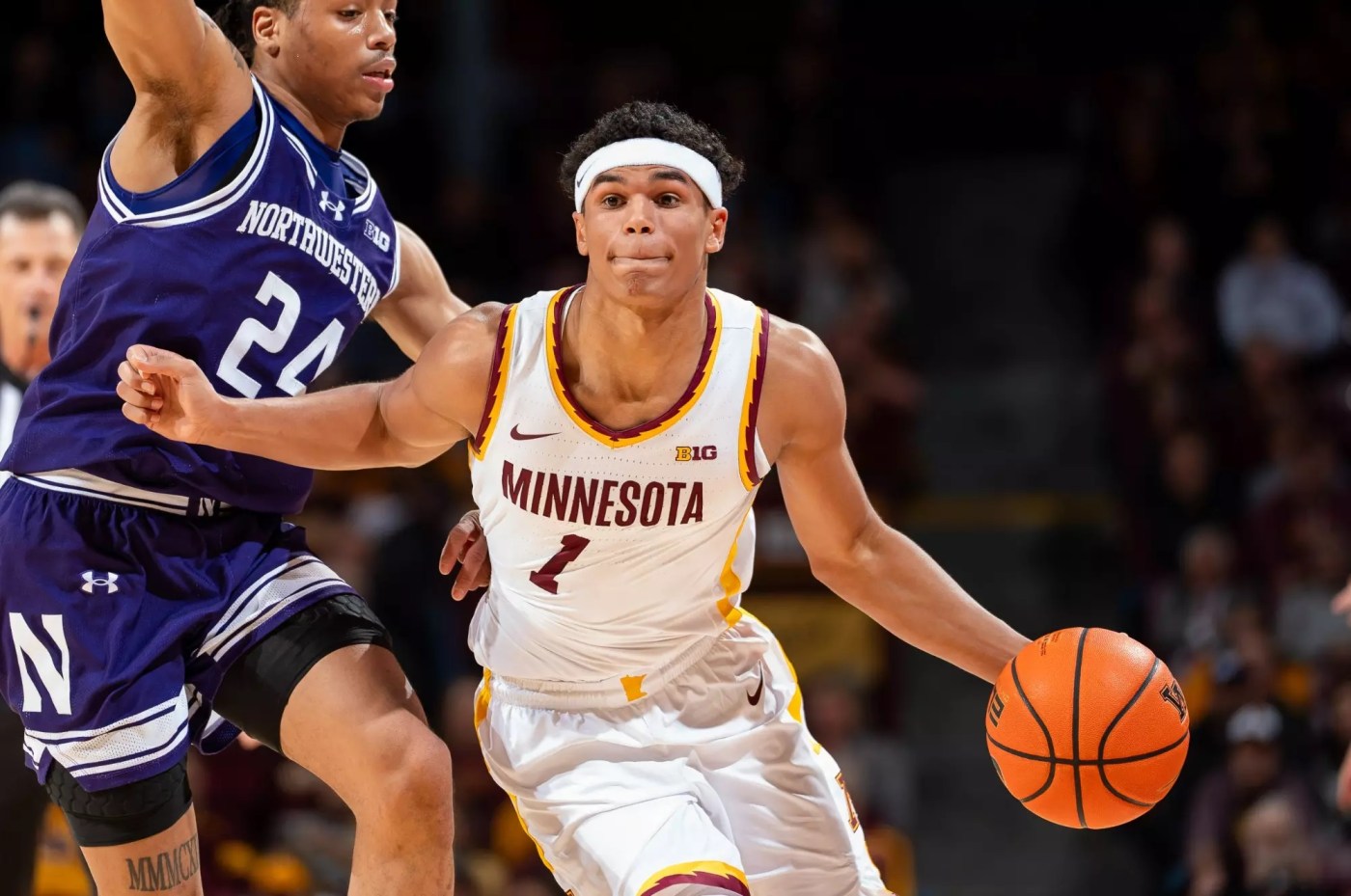 Minnesota’s Frank Mitchell, left, gets underneath Northwestern defender Keenan Fitzmorris during the Gophers’ 75-63 loss Tuesday, Feb. 25, 2025, at Williams Arena. (Brad Rempel / Gophers Athletics)