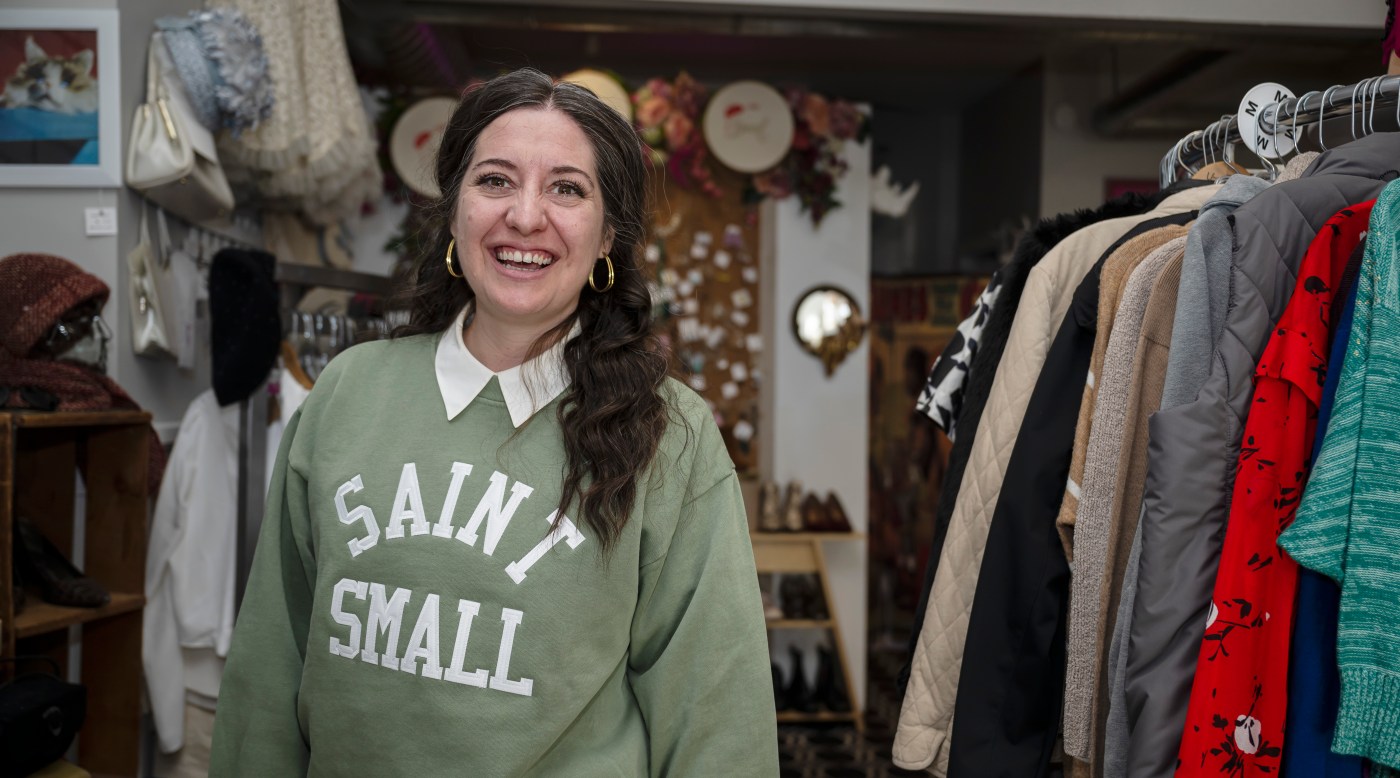 Her sweatshirt, which spells out the message, “Saint Small,” speaks to the vibe of the thrift store as well as this corner of St. Paul.