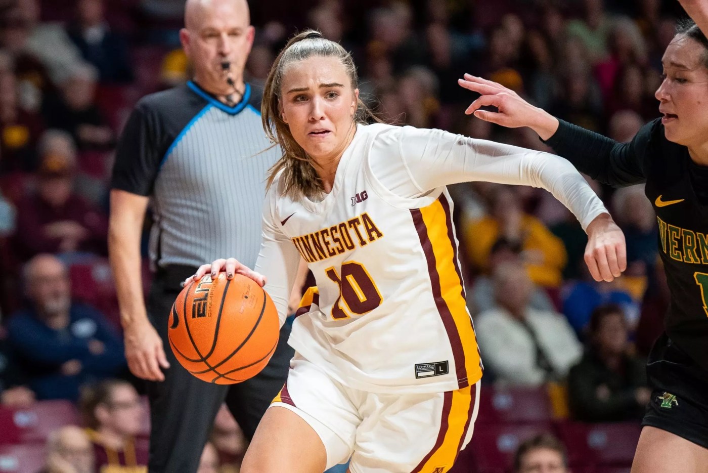 Minnesota’s Mara Braun avoids a defender during a 74-52 victory over Vermont on Nov. 8, 2024, at Williams Arena. (Keya Shapiro / Gophers Athletics)