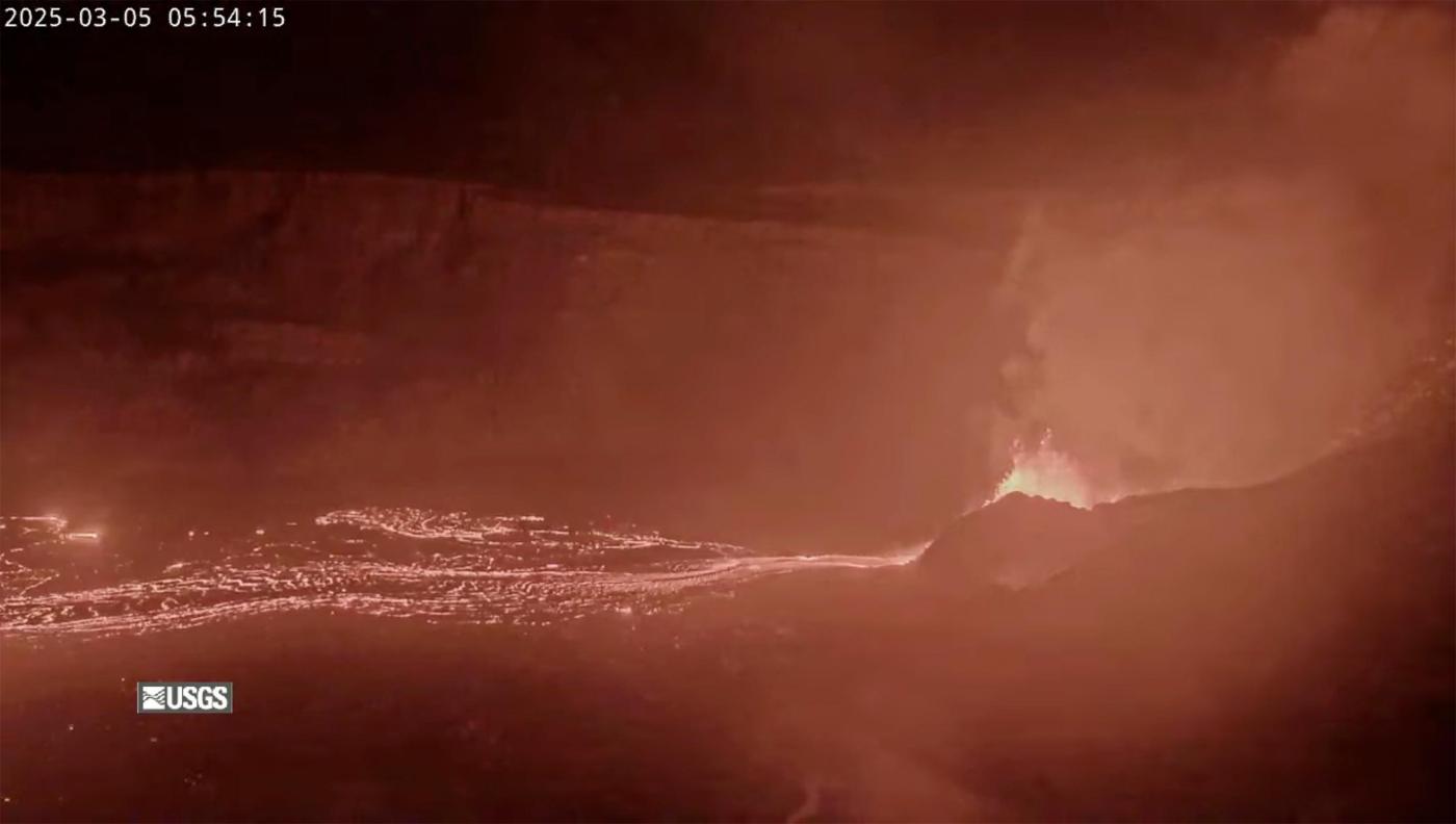 Fountains dropped in height 250 feet (80 meters) to 300 feet (90 meters) on Tuesday night, according to the Hawaii Volcano Observatory. On Wednesday morning, a webcam still showed tall bursts of fiery red lava and billowing smoke.