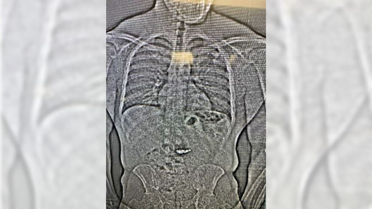 An X-ray of the suspect’s torso showed what the Orlando Police Department believed to be the diamond earrings — a white mass shining brightly against the grey backdrop of his digestive tract.