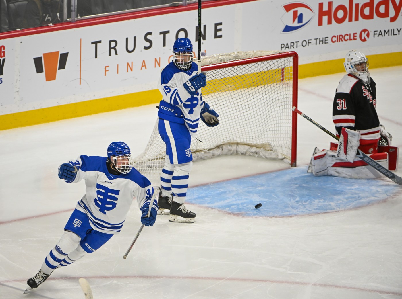 St. Thomas scored first, from a scrum at the net. With the puck bouncing between sticks and skates, Rudh skated through the right circle to the crease, where the puck was free. He pounced, and the Cadets were up 1-0 just 1:19 into the opening period.