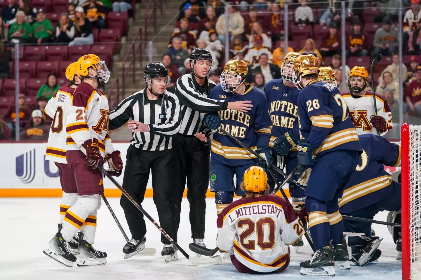 The Gophers lost senior center Aaron Huglen to an apparent leg injury early in the second after Notre Dame’s Henry Nelson crashed the net and sent Huglen flying into Airey.