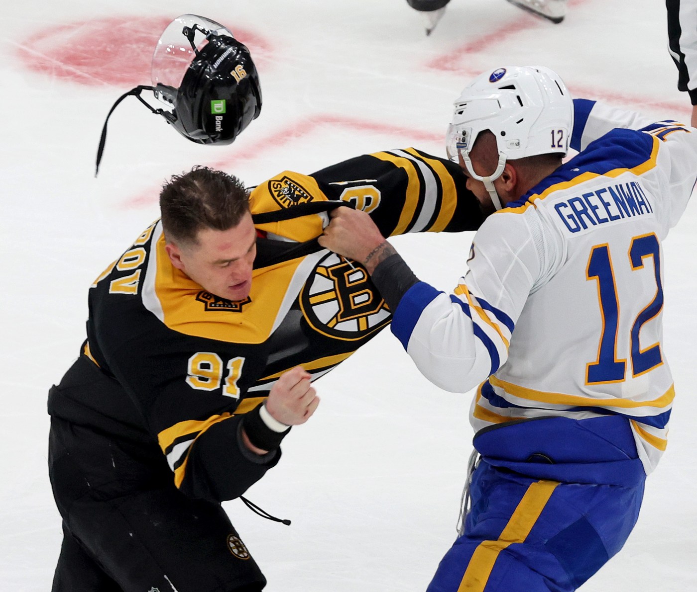 Before the B’s goals came a big-boy fight between two towering men, Nikita Zadorov and Jordan Greenway, both of whom stand 6-foot-6. After Greenway landed a decent shot, Zadorov caught Greenway with a punch to the side of the head then pushed the Sabre to the ice.