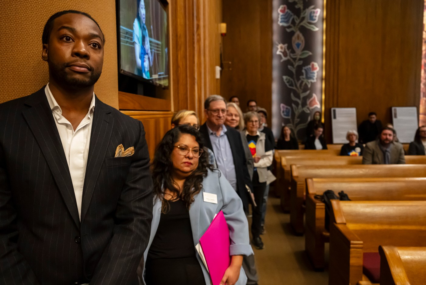 North End homeowner Adam Dullinger, left, speaks against a proposed amendments to the St. Paul rent control ordnance during a public hearing before the St. Paul City Council in council chambers at St. Paul City Hall on Wednesday, April 9, 2025. (John Autey / Pioneer Press)