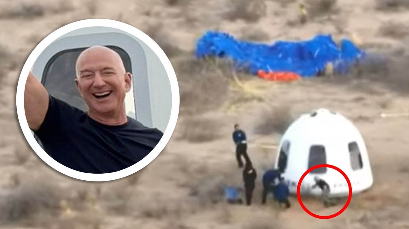 Shortly after the craft touched down in Texas with Sanchez, singer Katy Perry, newscaster Gayle King and three other spacefarers inside, an excited Bezos circled the vessel and tried to find the door. He tripped before he could open it but did not appear injured after quickly popping back up and embracing Sanchez.