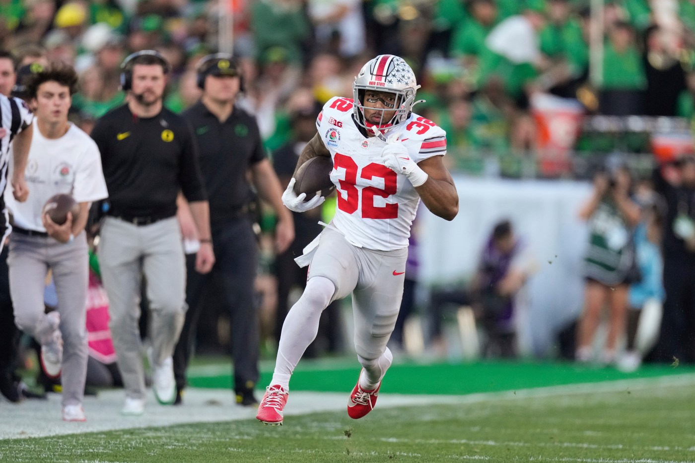 Henderson is a speedy, undersized running back out of head coach Mike Vrabel’s alma mater. The 5-foot-10, 202-pound ball carrier ran a 4.43-second 40-yard dash at the NFL Scouting Combine and averaged 7.1 yards per carry in 2024 for the national champion Buckeyes.