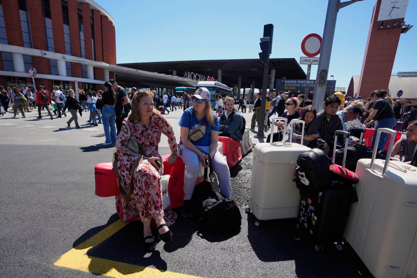 A police officer tells travelers to vacate the area in front of Atocha rail station during a massive power cut affecting the entire Iberian peninsula and the south of France, in Madrid on Monday. (Photo by Paul Hanna / AFP via Getty Images)
