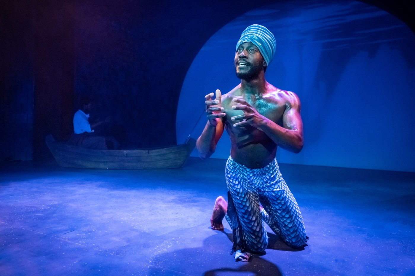 Yet there’s some of that afoot as well, for these two lovers are dancing on Africa’s west coast and Adu’s character is soon swept into slavery. With this, Moss becomes a man driven, obsessed with being reunited with his partner and willing to paddle across an ocean to find him. Along the way, he meets a trickster of a talking fish, a seductive moon and a wise sun, all anthropomorphized by Adu and costumed in some imaginative attire by Gregory Horton.