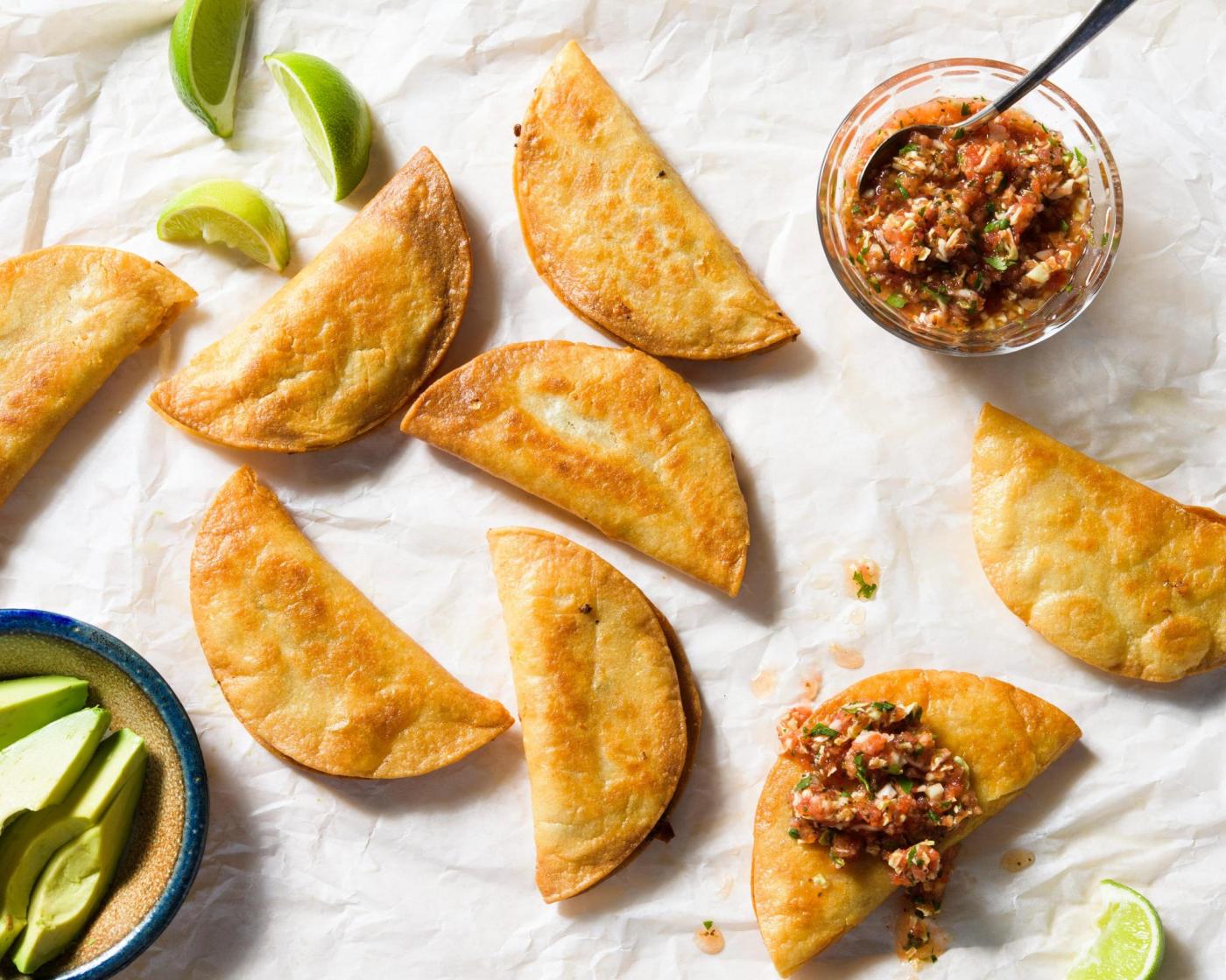 Return the oil to medium and heat until shimmering (about 350°F). Carefully add 4 of the tacos and cook until golden brown and crisp on the bottoms, about 3 minutes. Using a thin metal spatula, flip each taco and cook until golden brown on the second sides, about 3 minutes, then transfer to a paper towel-lined plate. Fry the remaining tacos in the same way, adjusting the heat as needed.