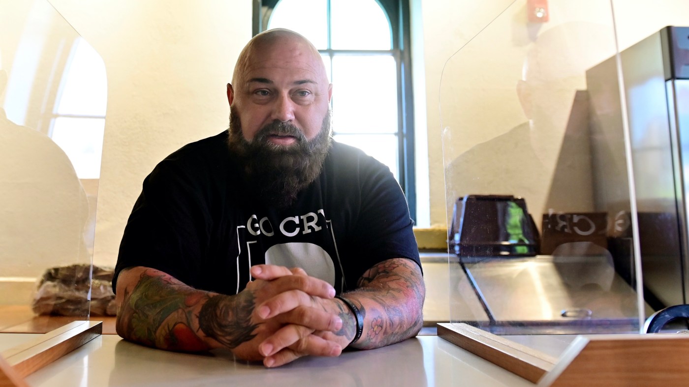 Brian Ingram, owner of the Hope Breakfast Bar near West Seventh Street, sits between two movable dividers he created for his counter on Wednesday, May 20, 2020. (John Autey / Pioneer Press)