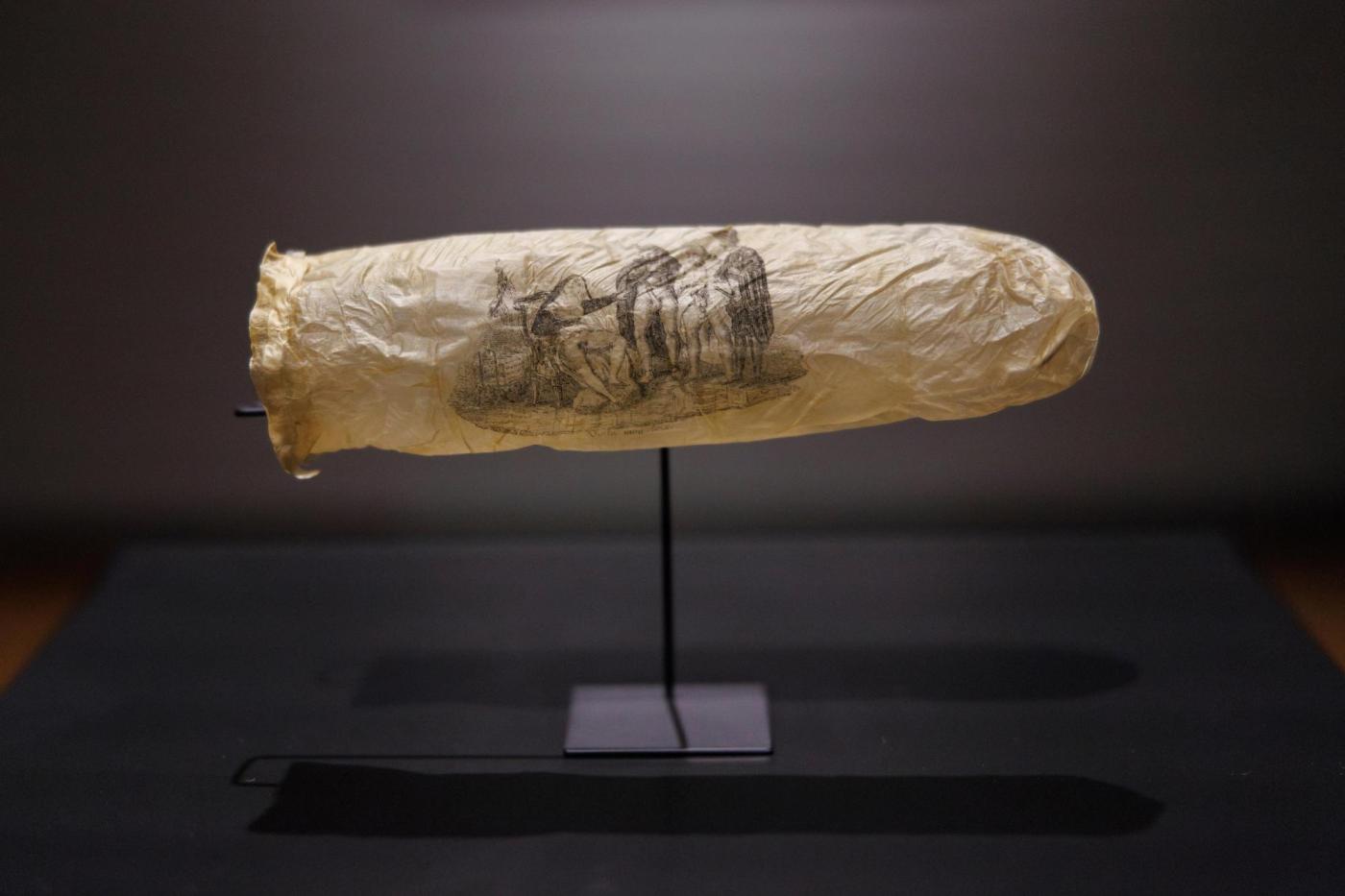 This image made available by the Rijksmueum shows a condom with print, circa 1830, displayed at Amsterdam’s Rijksmuseum. (Kelly Schenk/Rijksmuseum via AP)