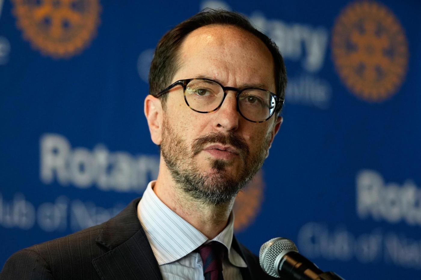 Mayor Freddie O’Connell speaks with members of the Rotary Club of Nashville, Monday, June 2, 2025, in Nashville, Tenn. (AP Photo/George Walker IV)