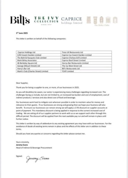 “This mandatory discount is being applied in response to the current increased costs of trading,” the letter, dated June 3 and signed by Jeremy Evans, Richard Caring’s head of indirect and beverage procurement, said. “We are asking all of our supplier partners to work with us as we support each other through this difficult period.”