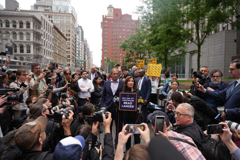 Gov. Kathy Hochul and NYC Comptroller Brad Lander outside the immigration court at 26 Federal Plaza Tuesday, where they condemned ICE’s tactic of detaining people at mandated court appointments. (Ayman Siam/Office of the NYC Comptroller)