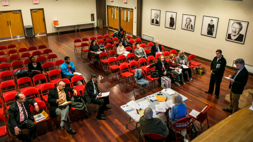 A Manhattan community board meeting in 2018. The authors are calling for better trainings for boards across the city around how to evaluate racial impact studies when weighing in on new development proposals. (Photo by Adi Talwar)